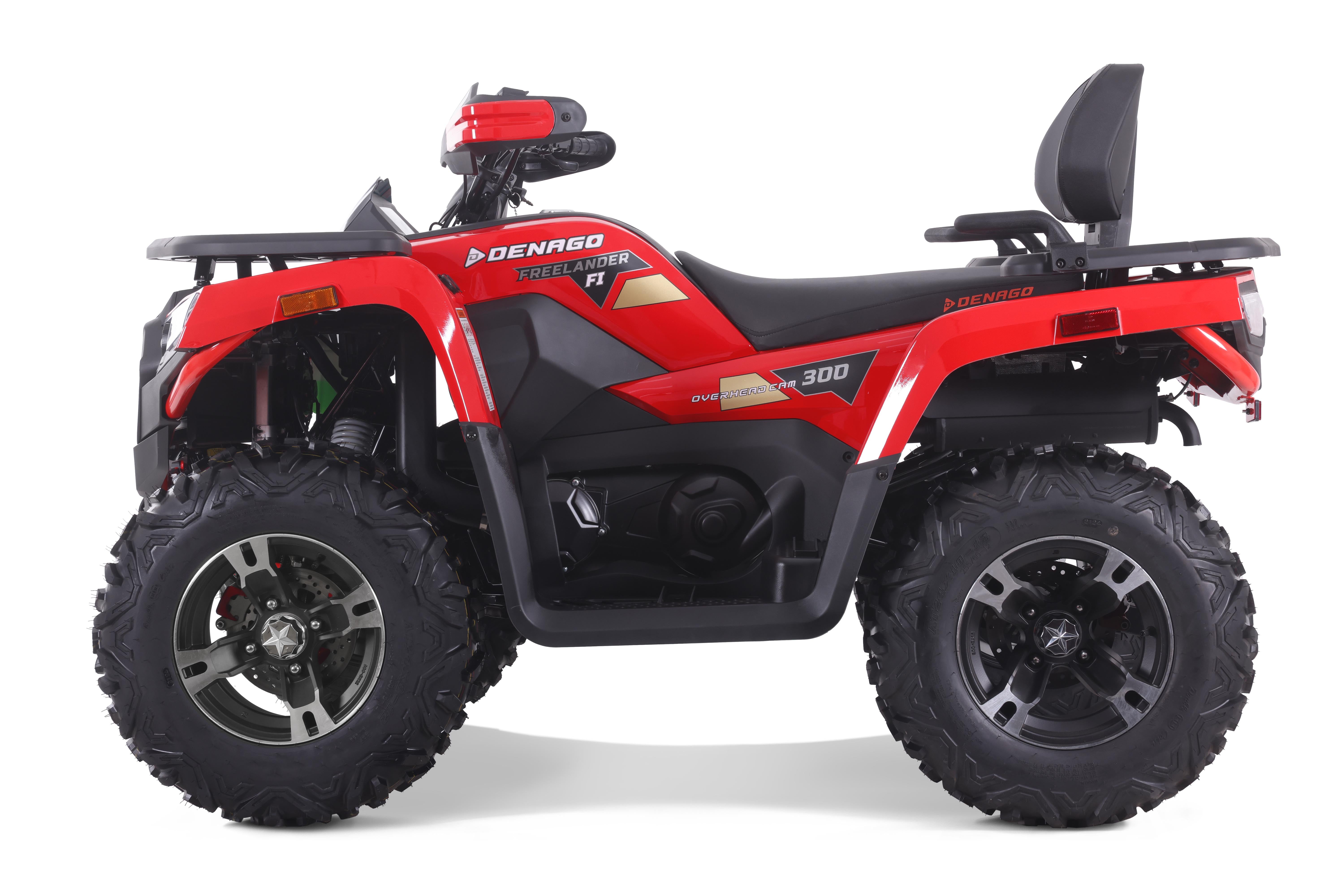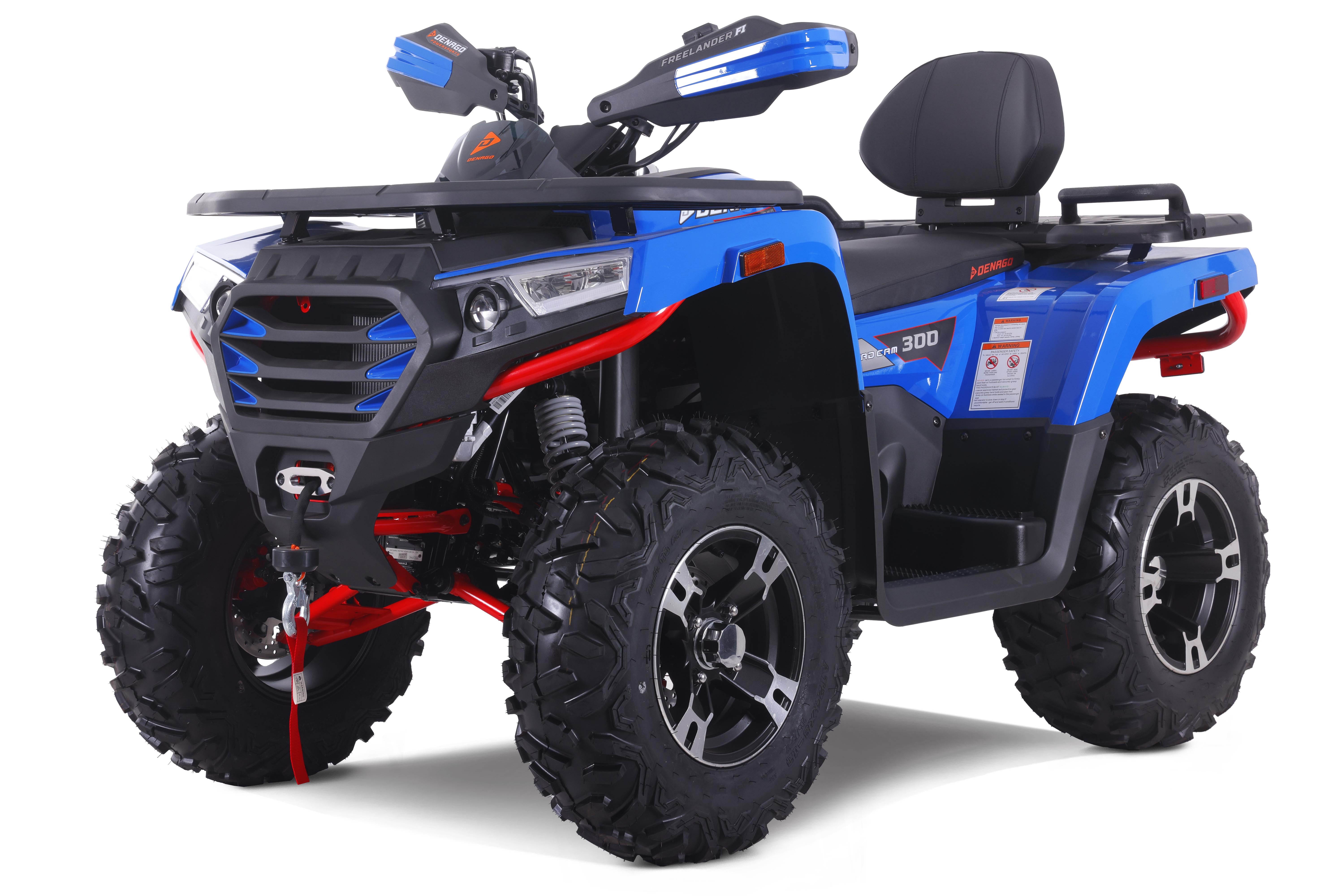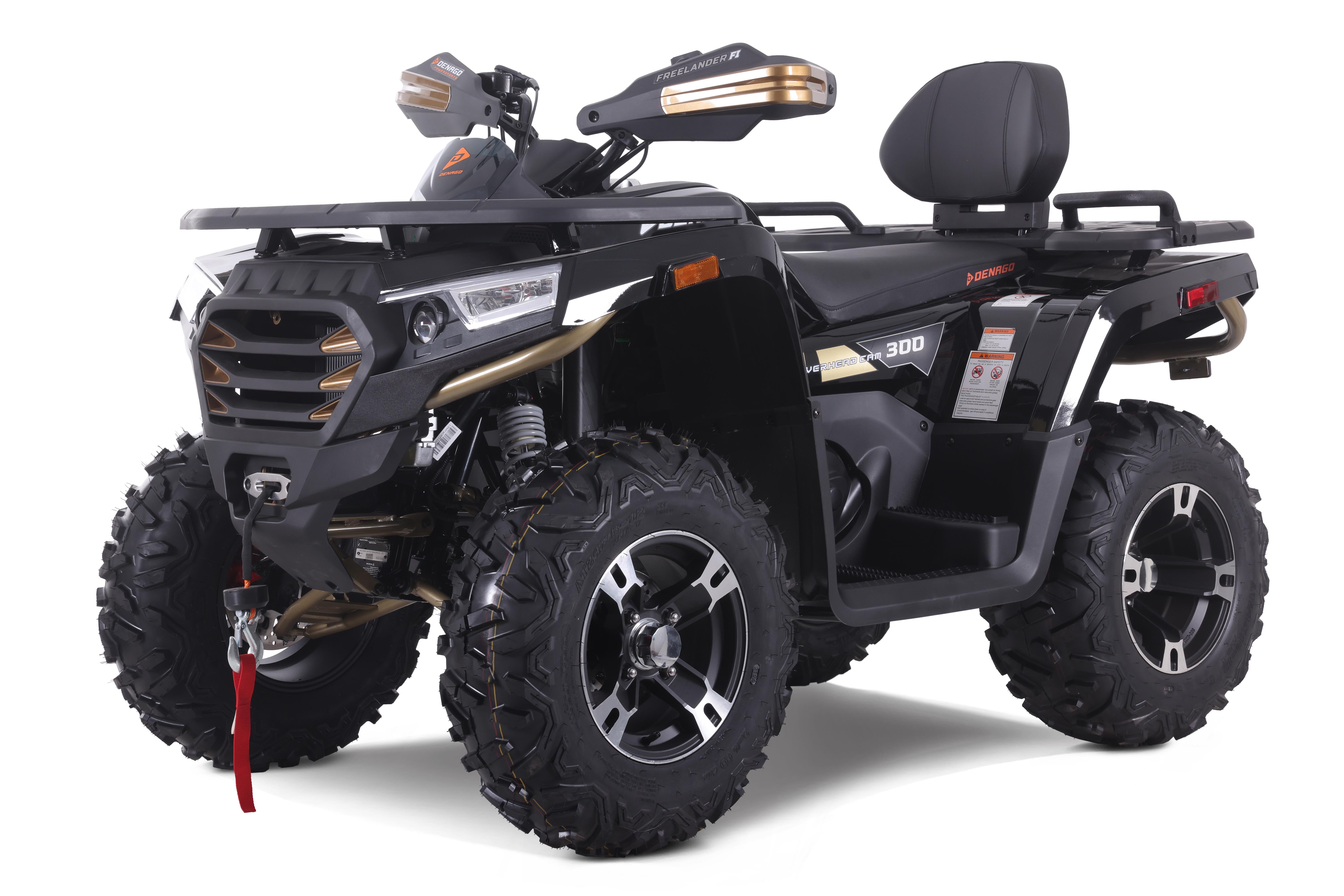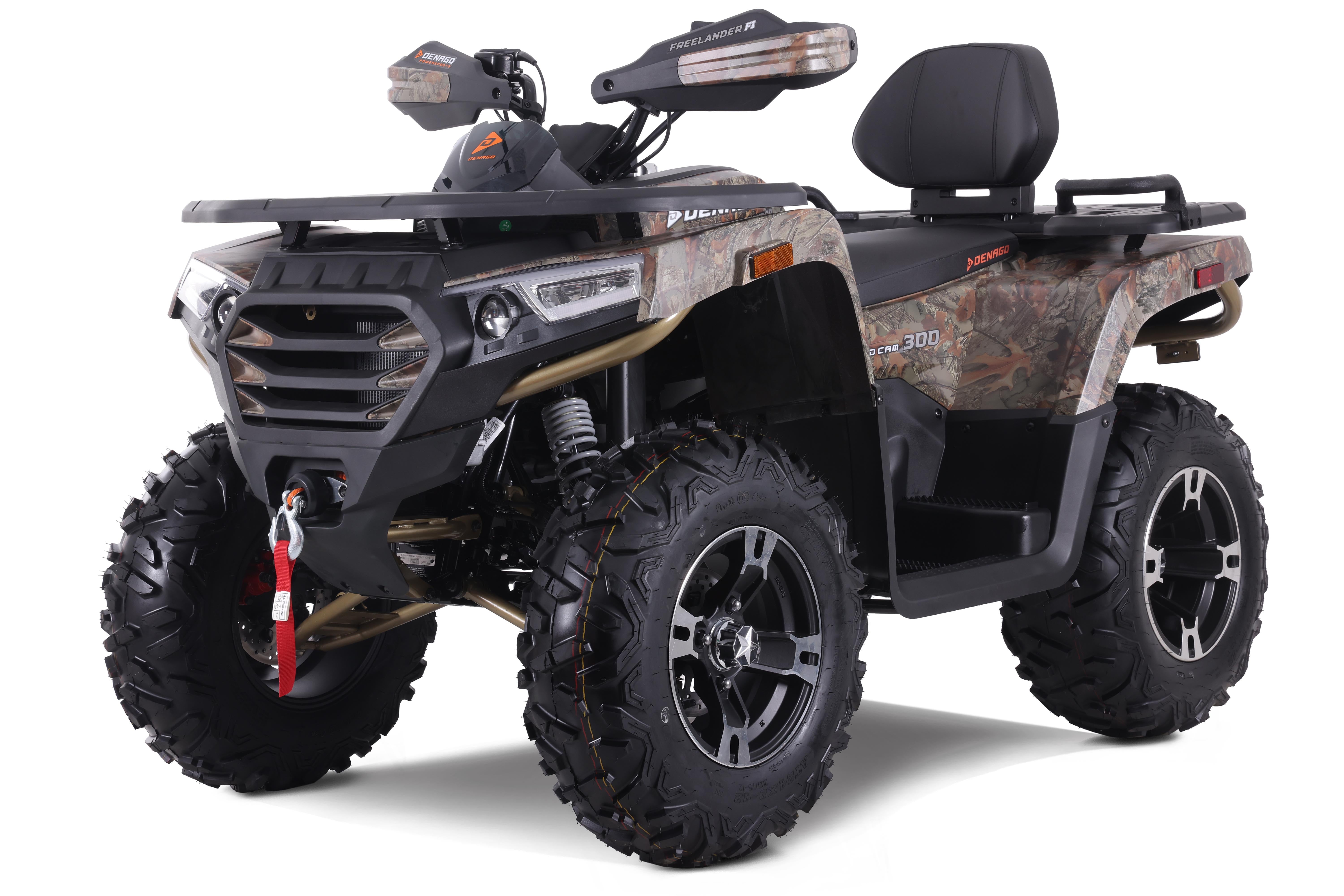 The Freelander 300FI takes ATV adventures to the next level, boasting a liquid-cooled overhead-cam engine paired to a CVT automatic transmission transmitting torque to big off road tires via a maintenance free shaft-drive system. It’s loaded with nice features like a fuel injected overhead-cam engine, double A arm front suspension with adjustable shocks, TFT instrumentation, 2-up seating, and lightweight aluminum wheels.
