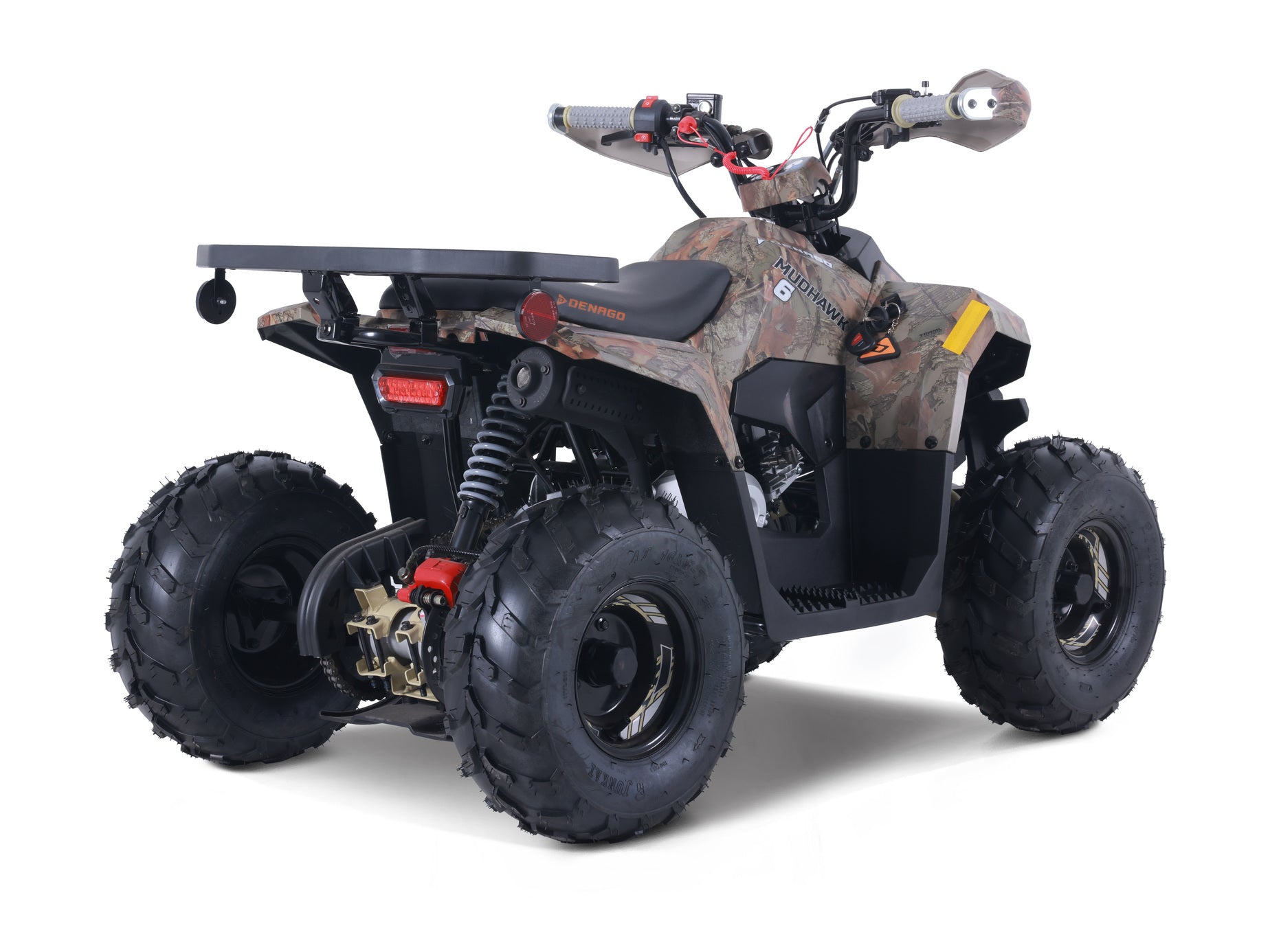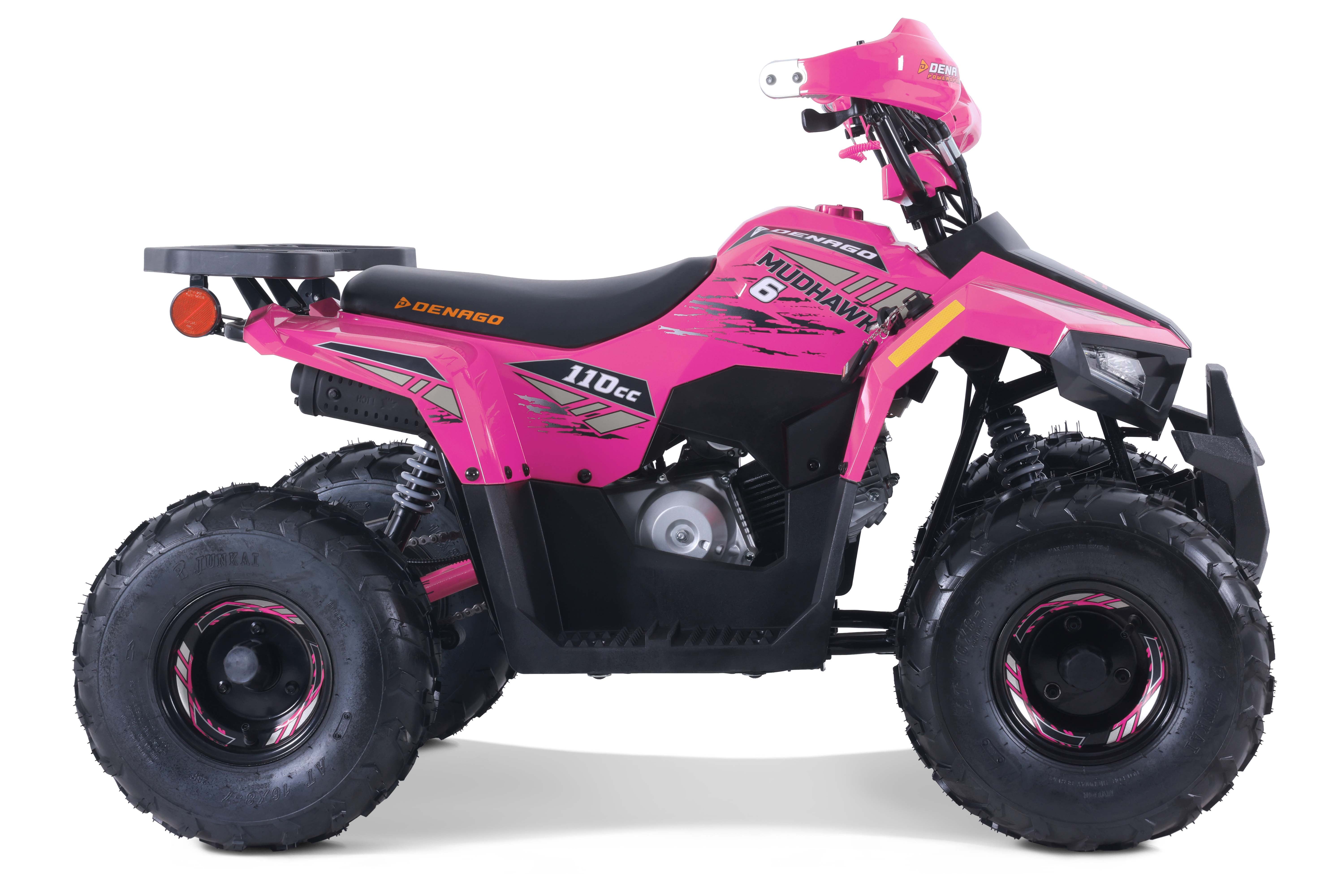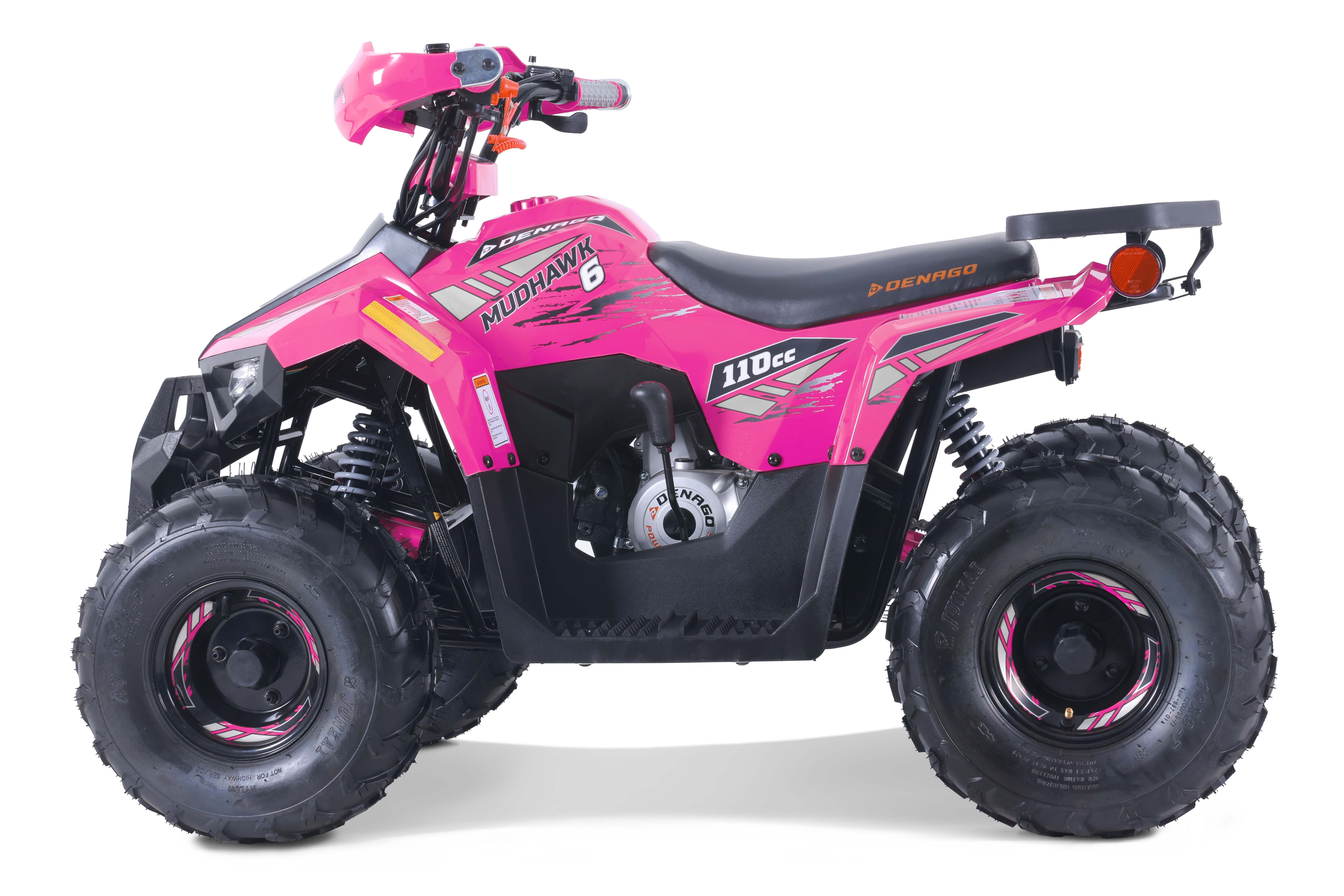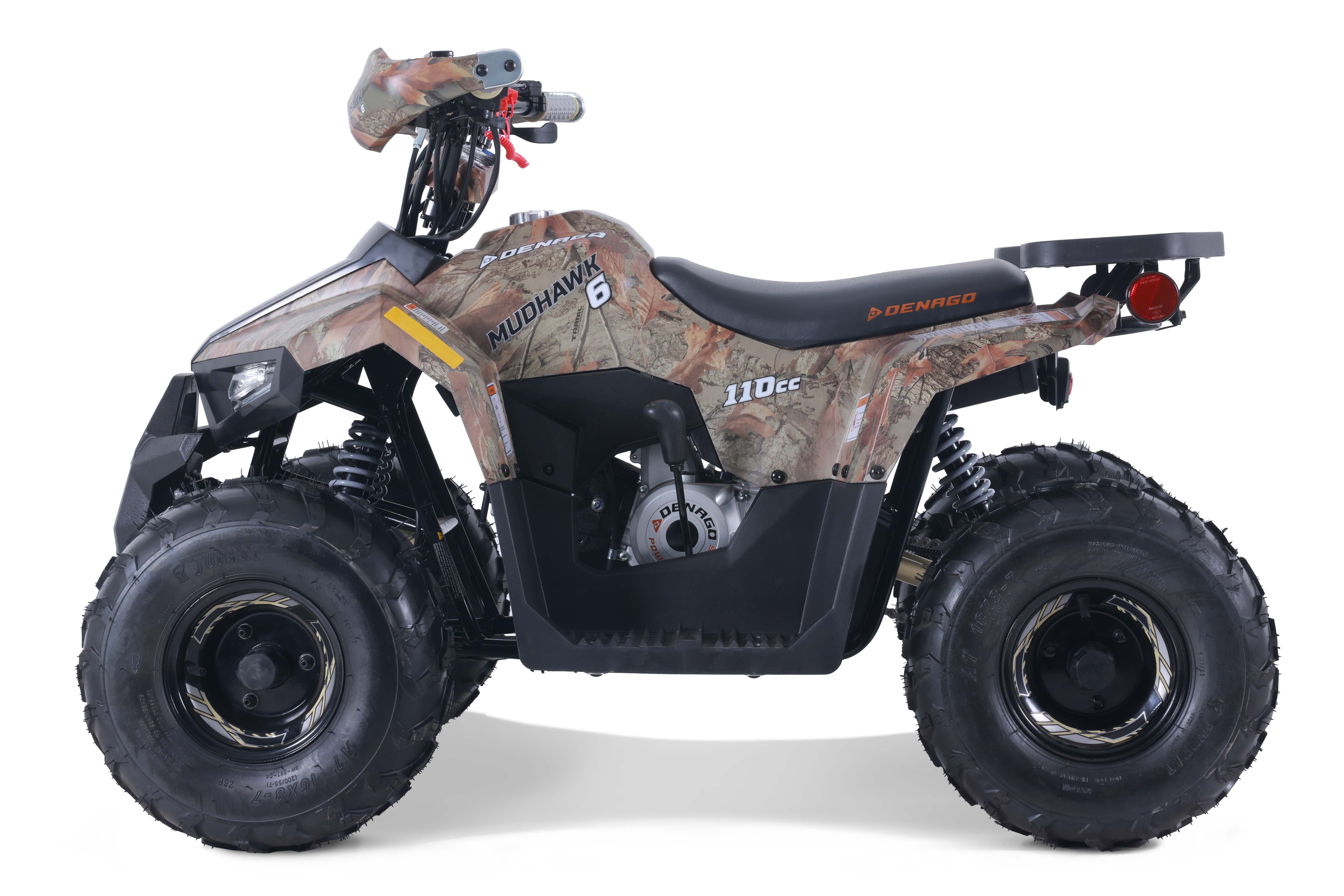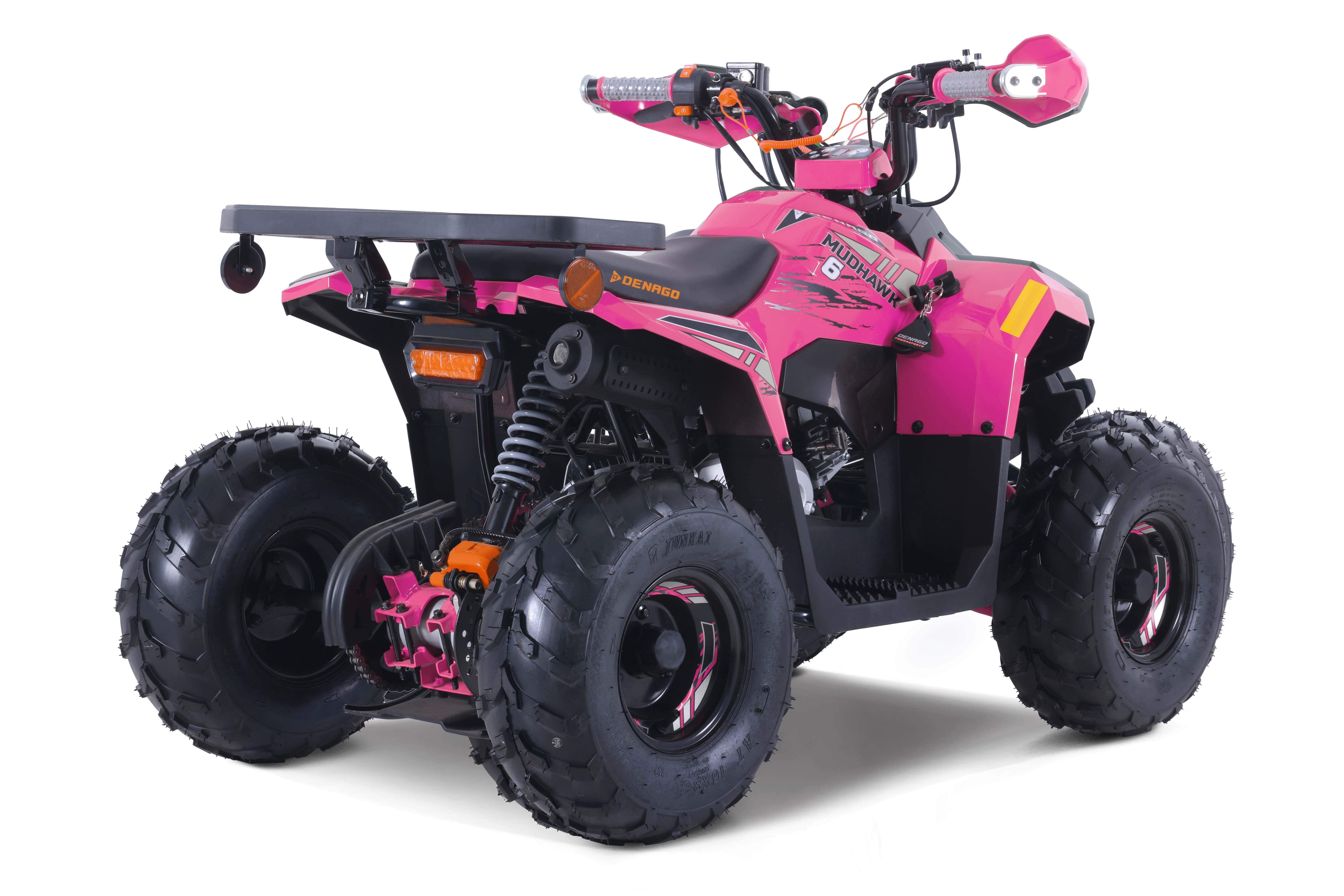 Hook your kids on a lifetime of adventure with the amazingly affordable Mudhawk 6. Rated for riders aged six and up, the Mudhawk 6 features the largest engine in its class and an automatic transmission that allows riders to go forward and reverse without using a clutch lever. Dual A-arm front suspension with adjustable shocks provide excellent bump control and stability. Safety is a priority at Denago, so the Mudhawk 6 includes a throttle limiter and remote shut-off to ensure a fun experience while young riders build confidence. The Mudhawk 6 is available in 7 different colors, including camo and pink, to suit the preferences of every young rider!