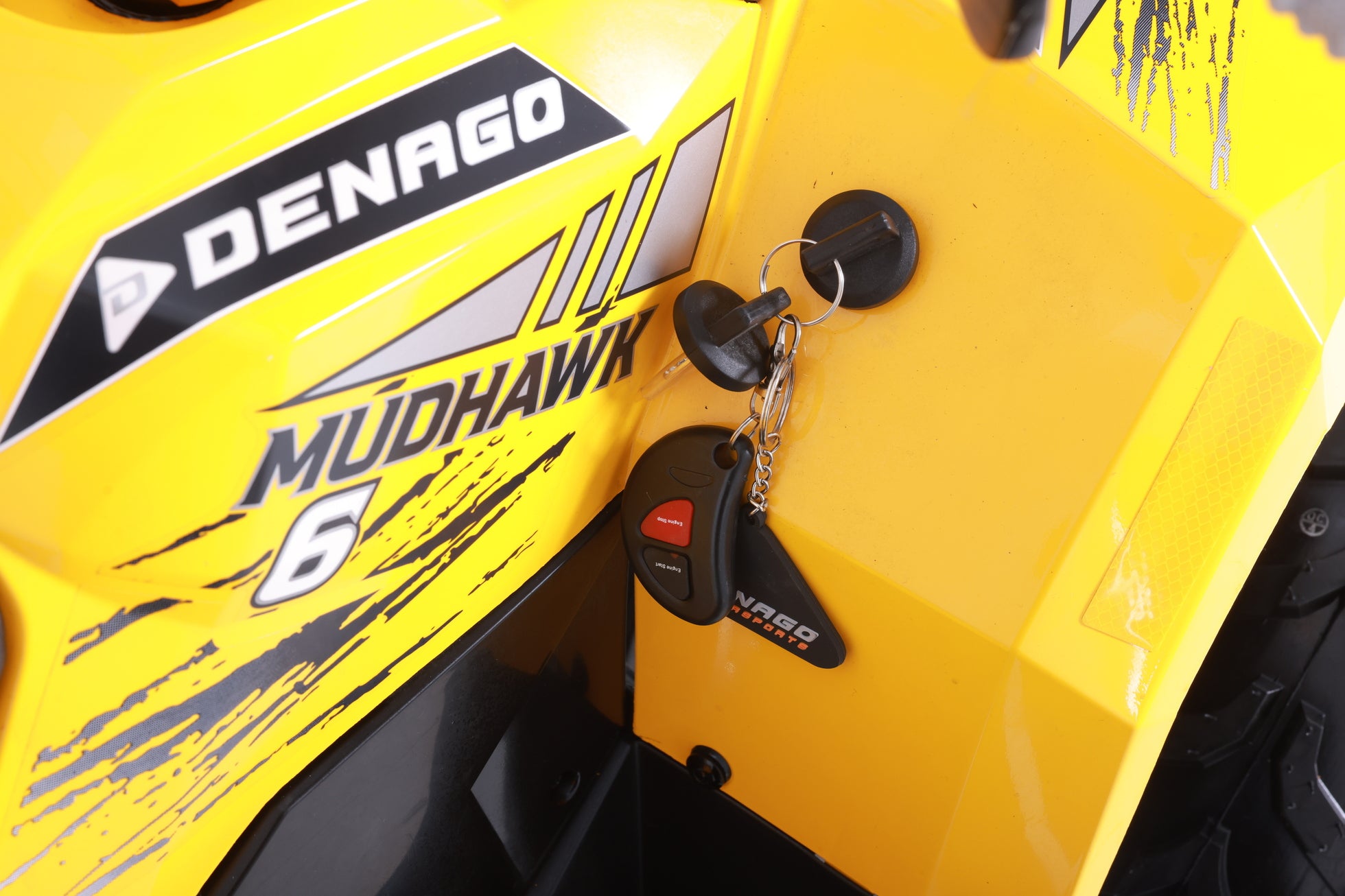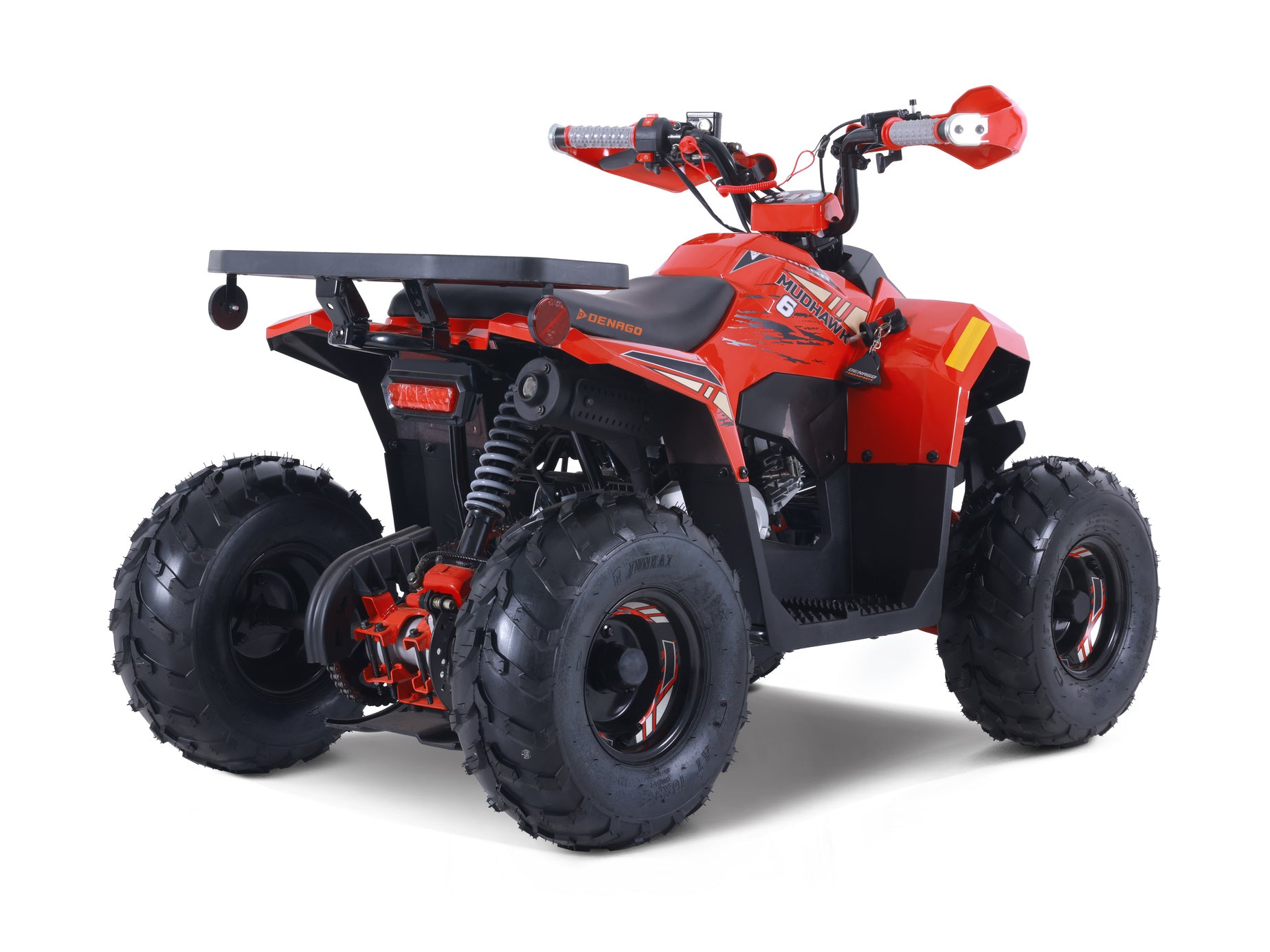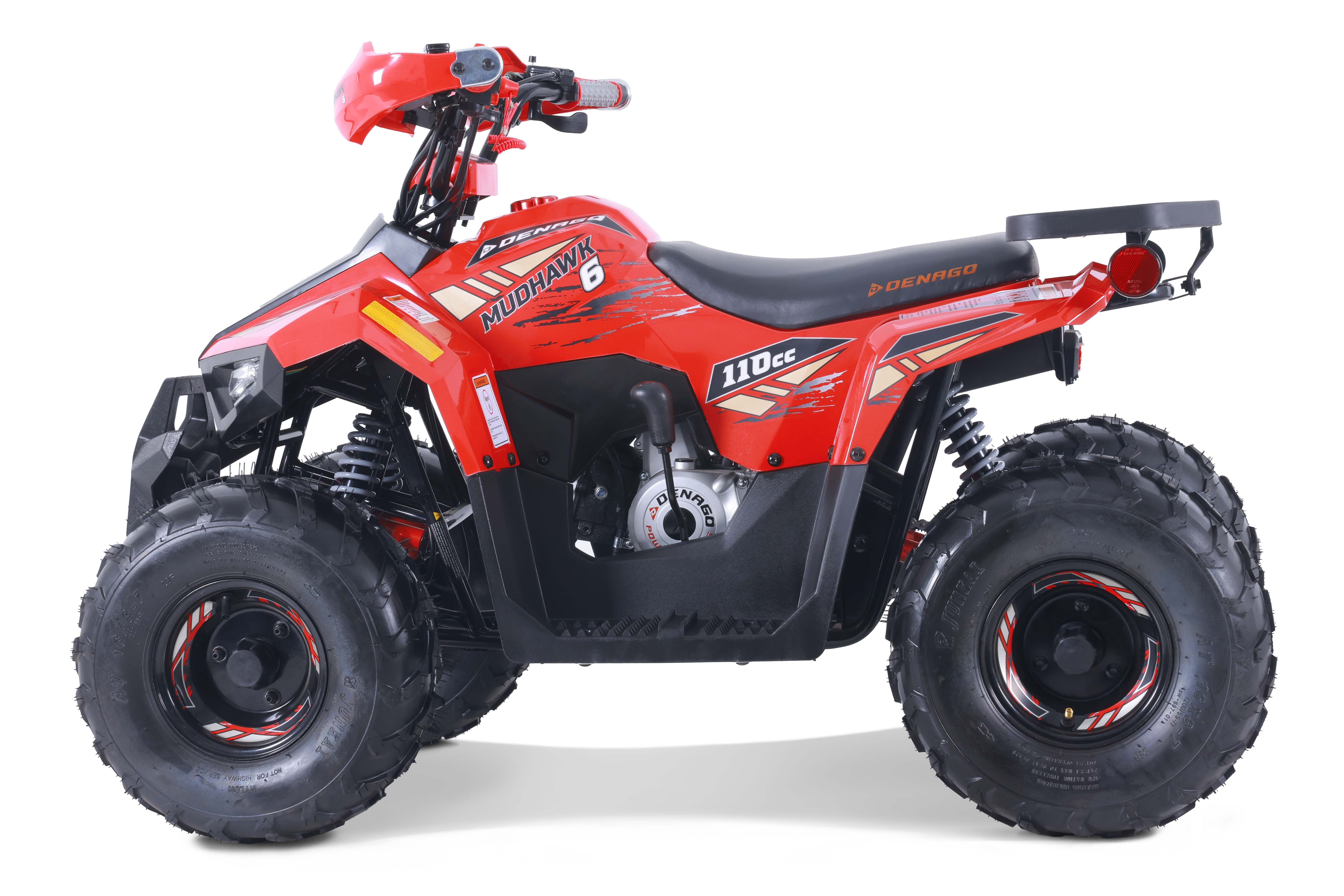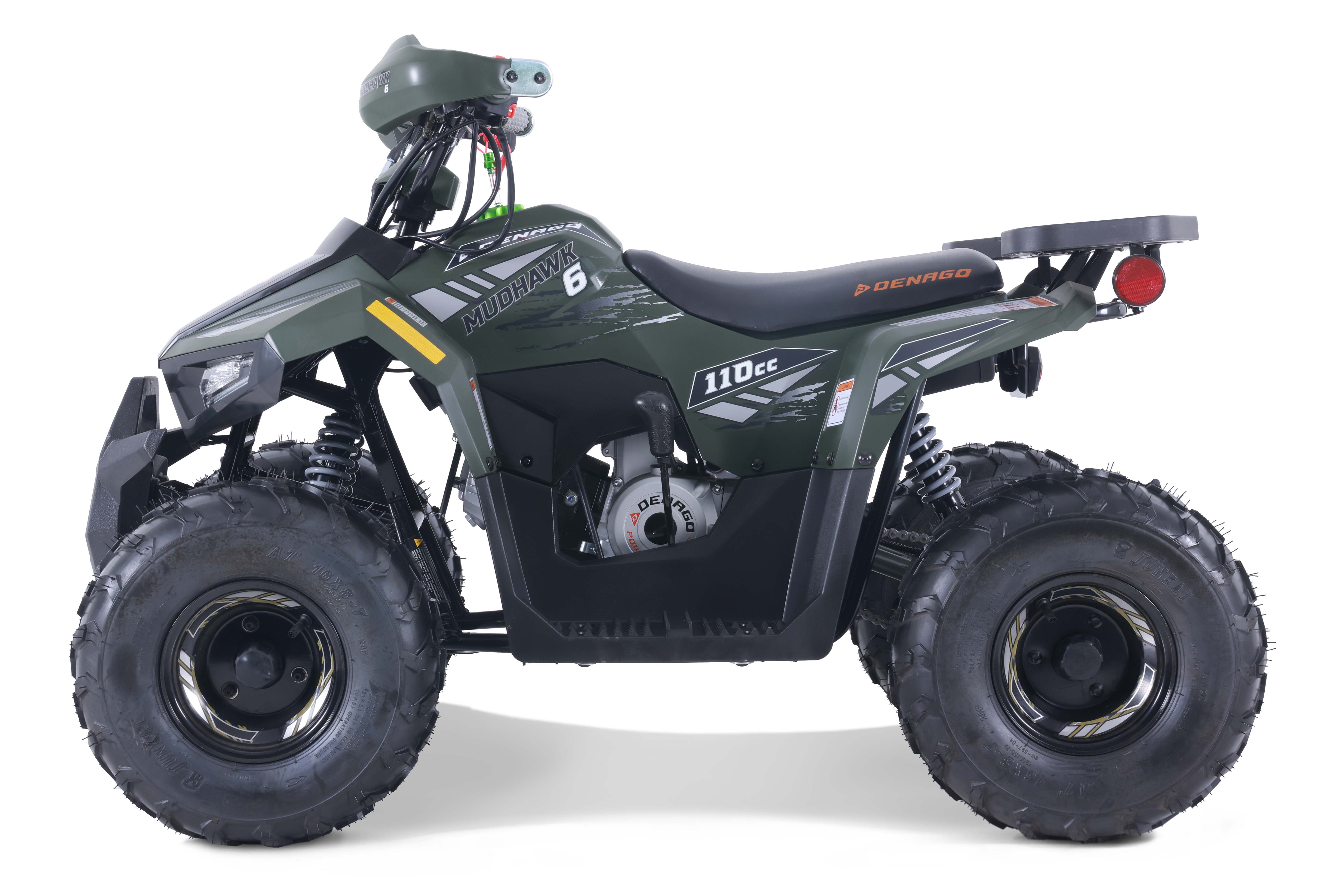 Hook your kids on a lifetime of adventure with the amazingly affordable Mudhawk 6. Rated for riders aged six and up, the Mudhawk 6 features the largest engine in its class and an automatic transmission that allows riders to go forward and reverse without using a clutch lever. Dual A-arm front suspension with adjustable shocks provide excellent bump control and stability. Safety is a priority at Denago, so the Mudhawk 6 includes a throttle limiter and remote shut-off to ensure a fun experience while young riders build confidence. The Mudhawk 6 is available in 7 different colors, including camo and pink, to suit the preferences of every young rider!
