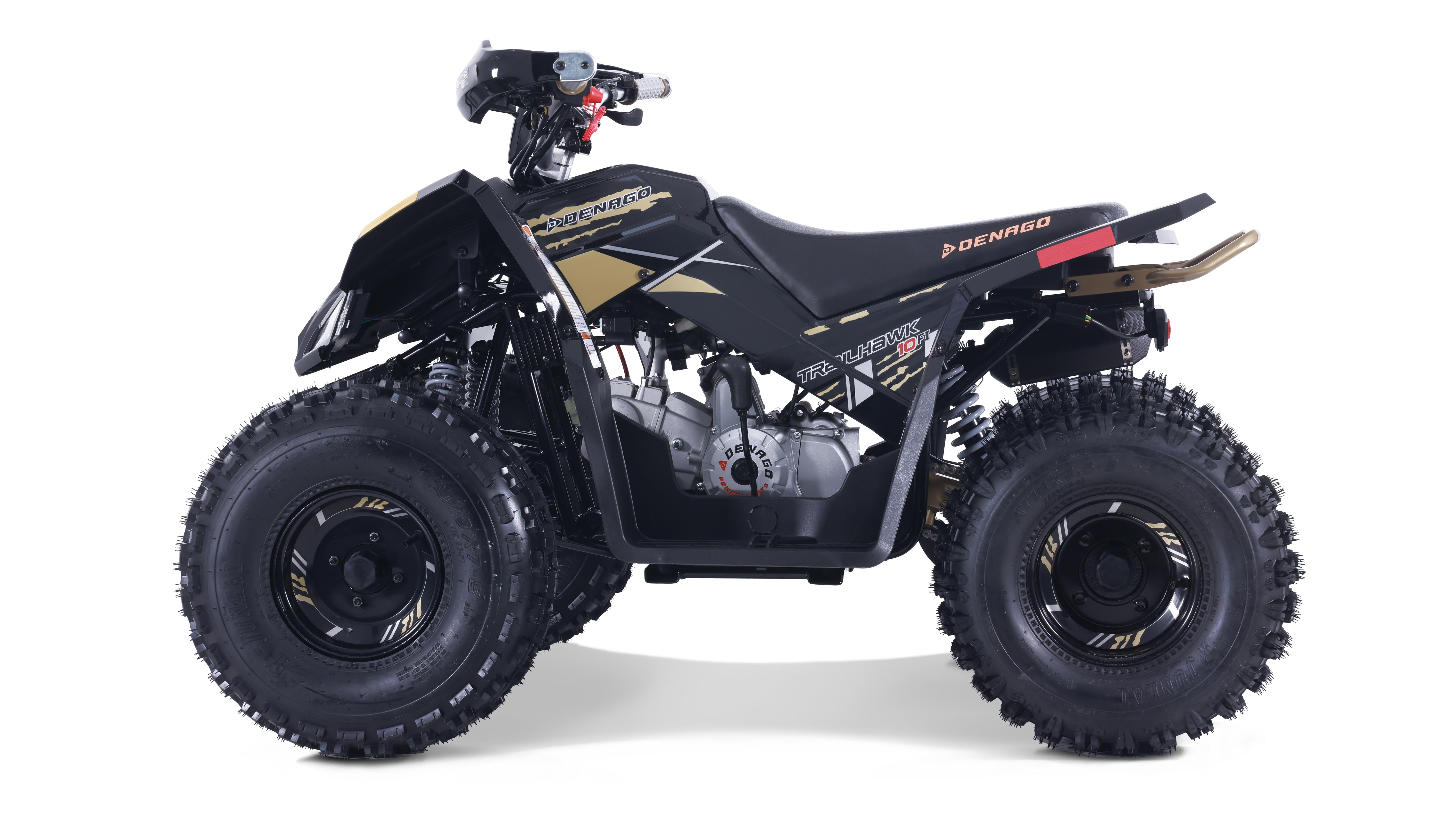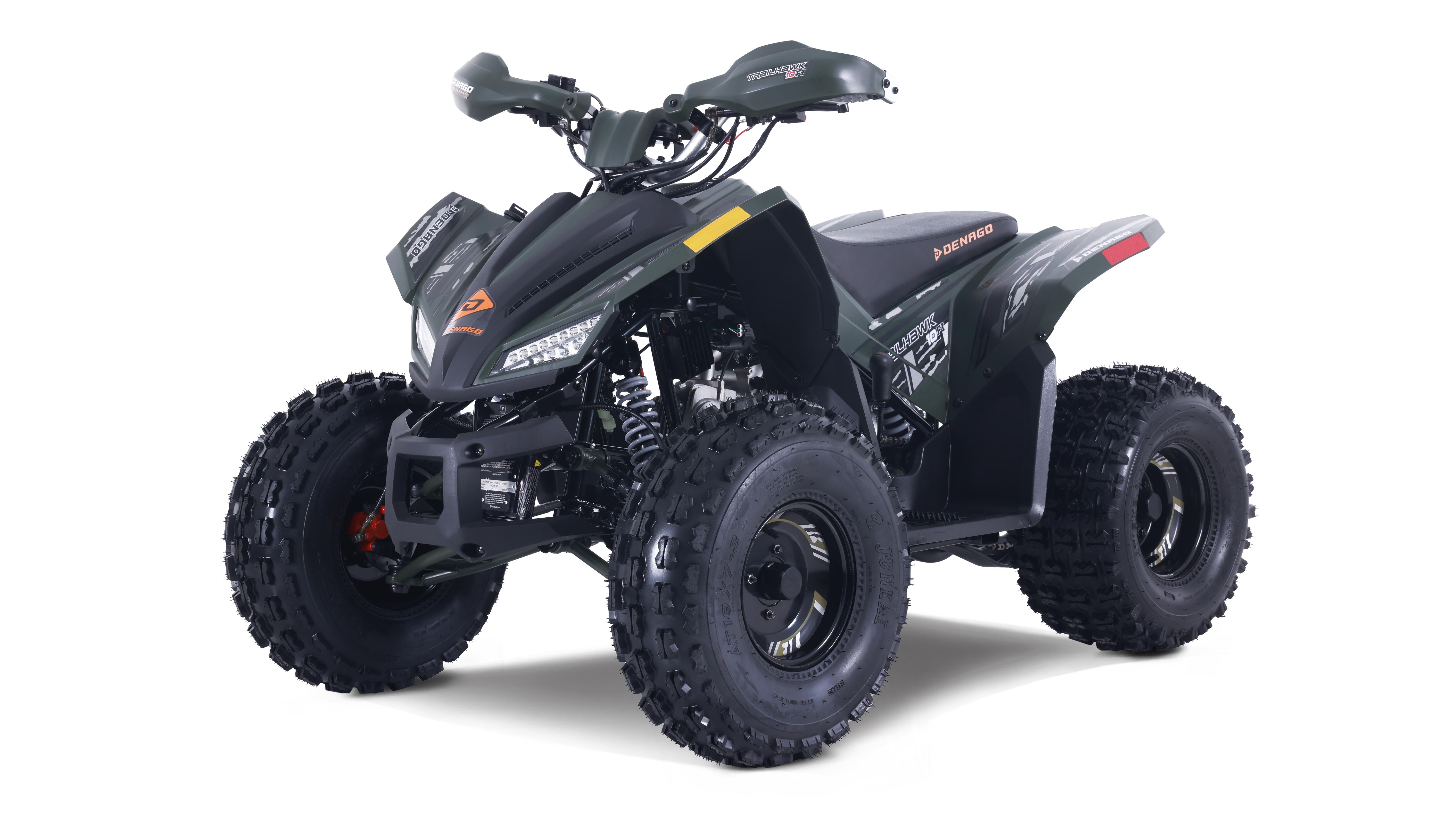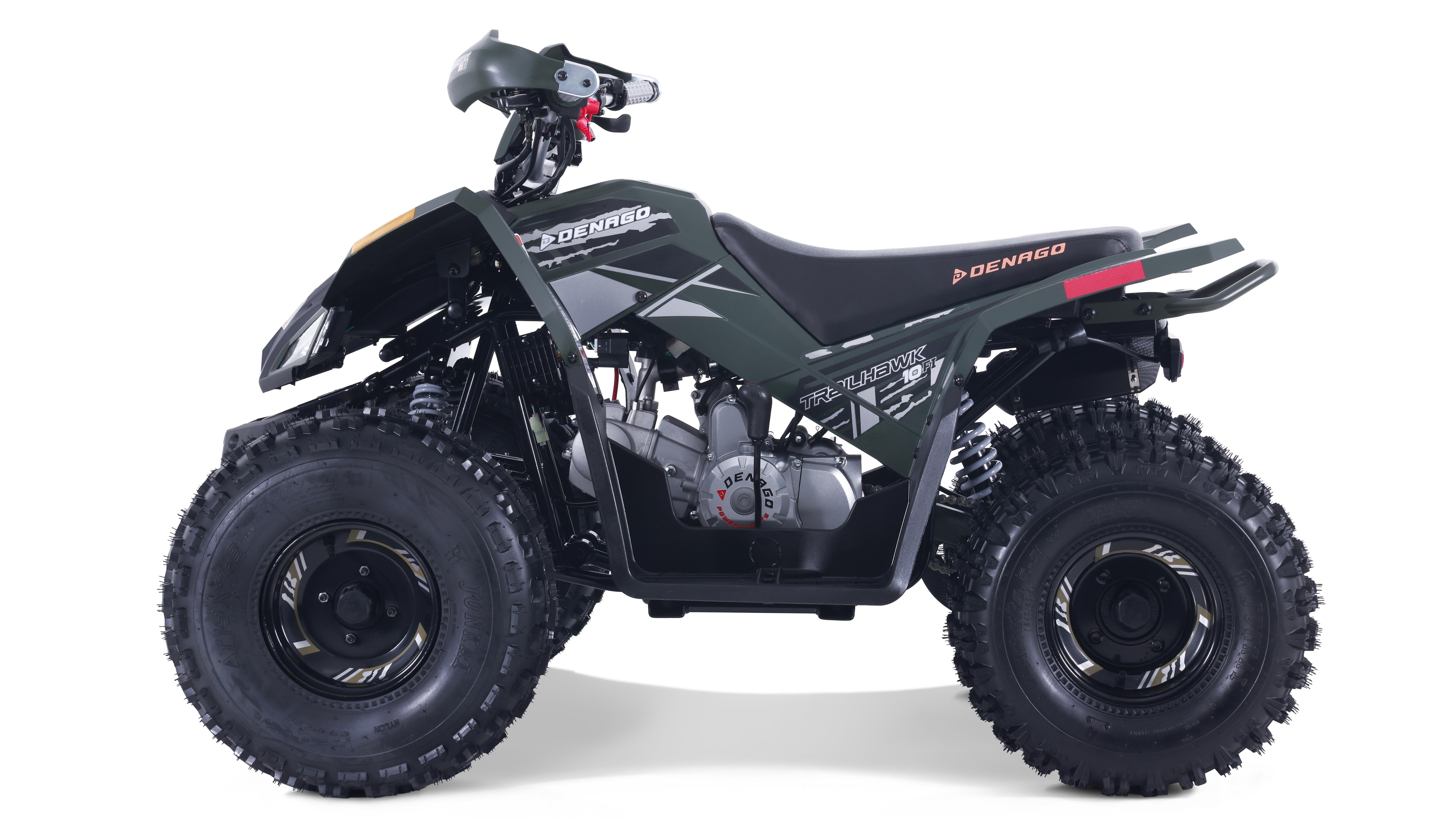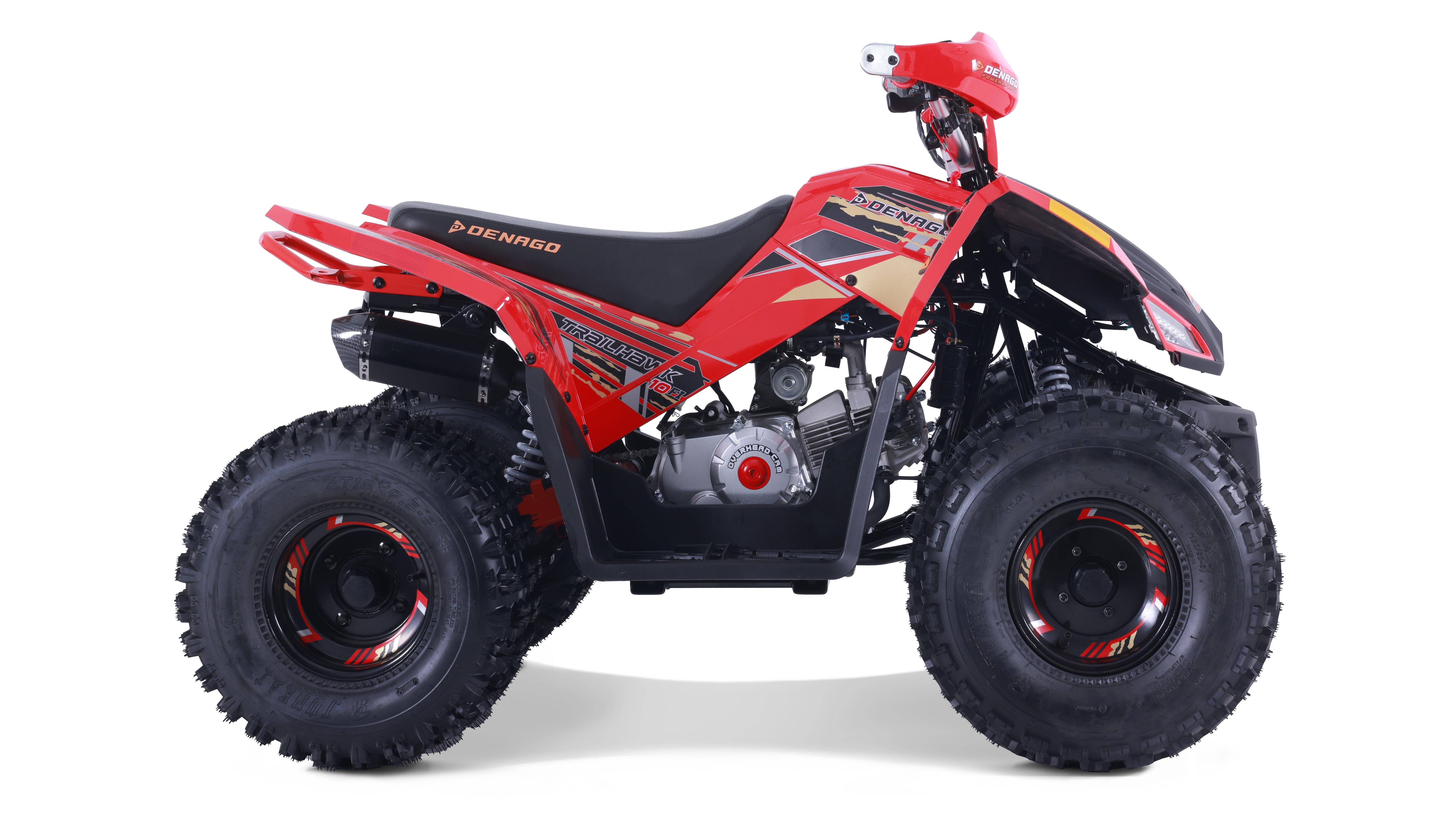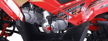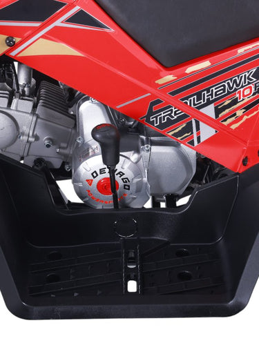 The Trailhawk 10FI is the sportiest Youth-10 ATV on the market, with independent double A-arm front suspension and adjustable shocks, a fuel-injected 120cc engine, electric starting, and sleek sporty style with color-matched handguards and grips. It’s available in 6 colors.