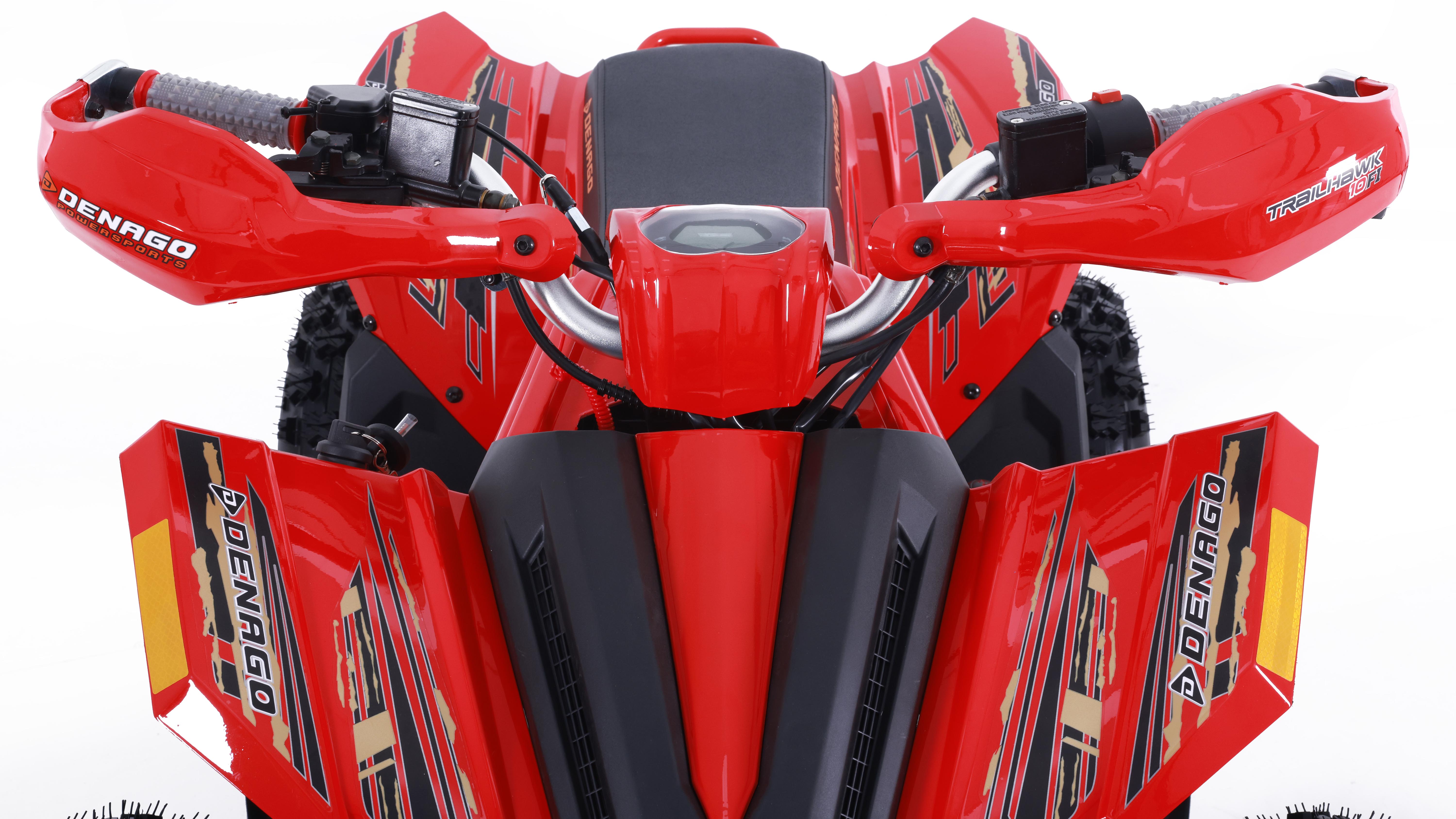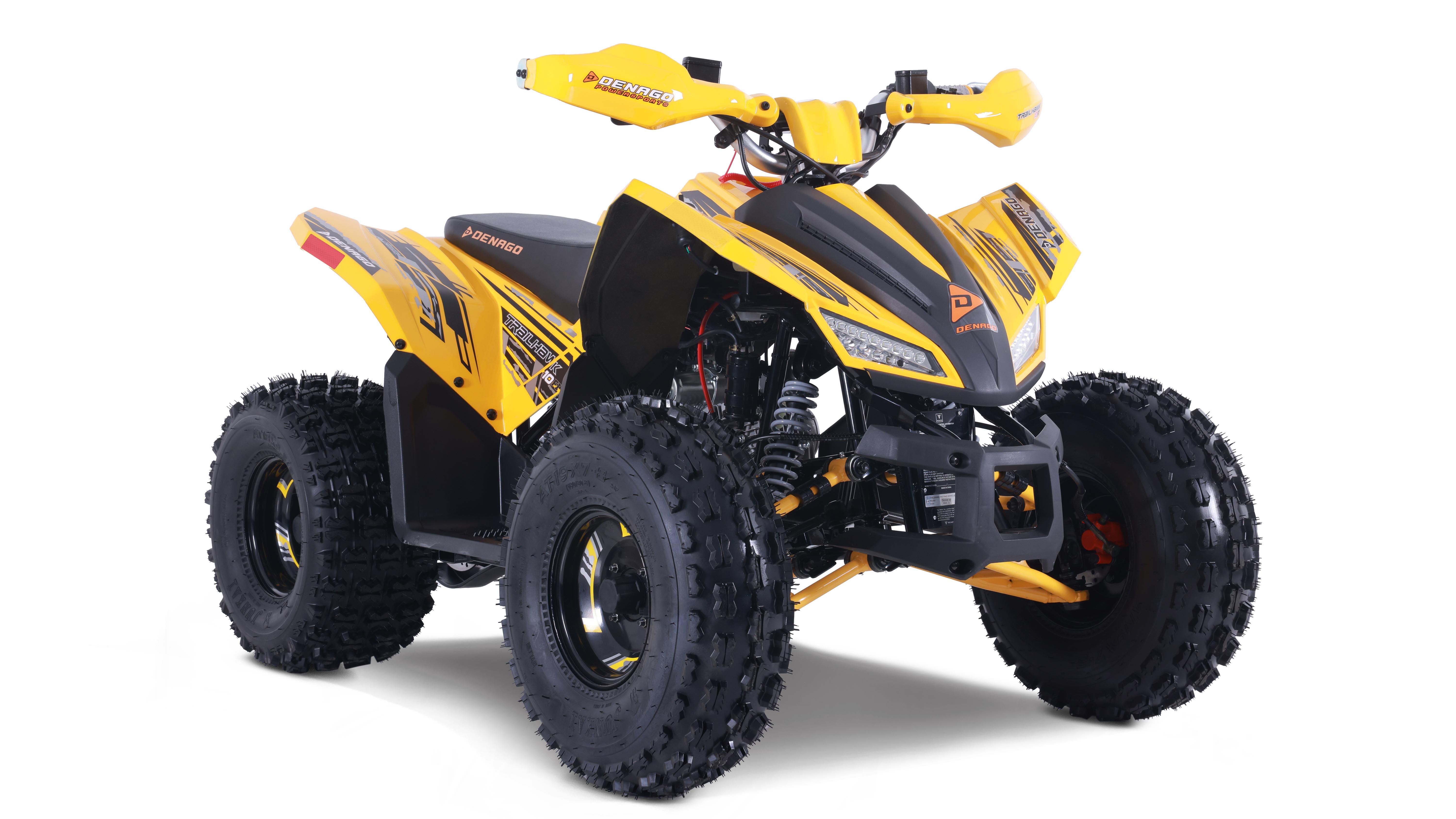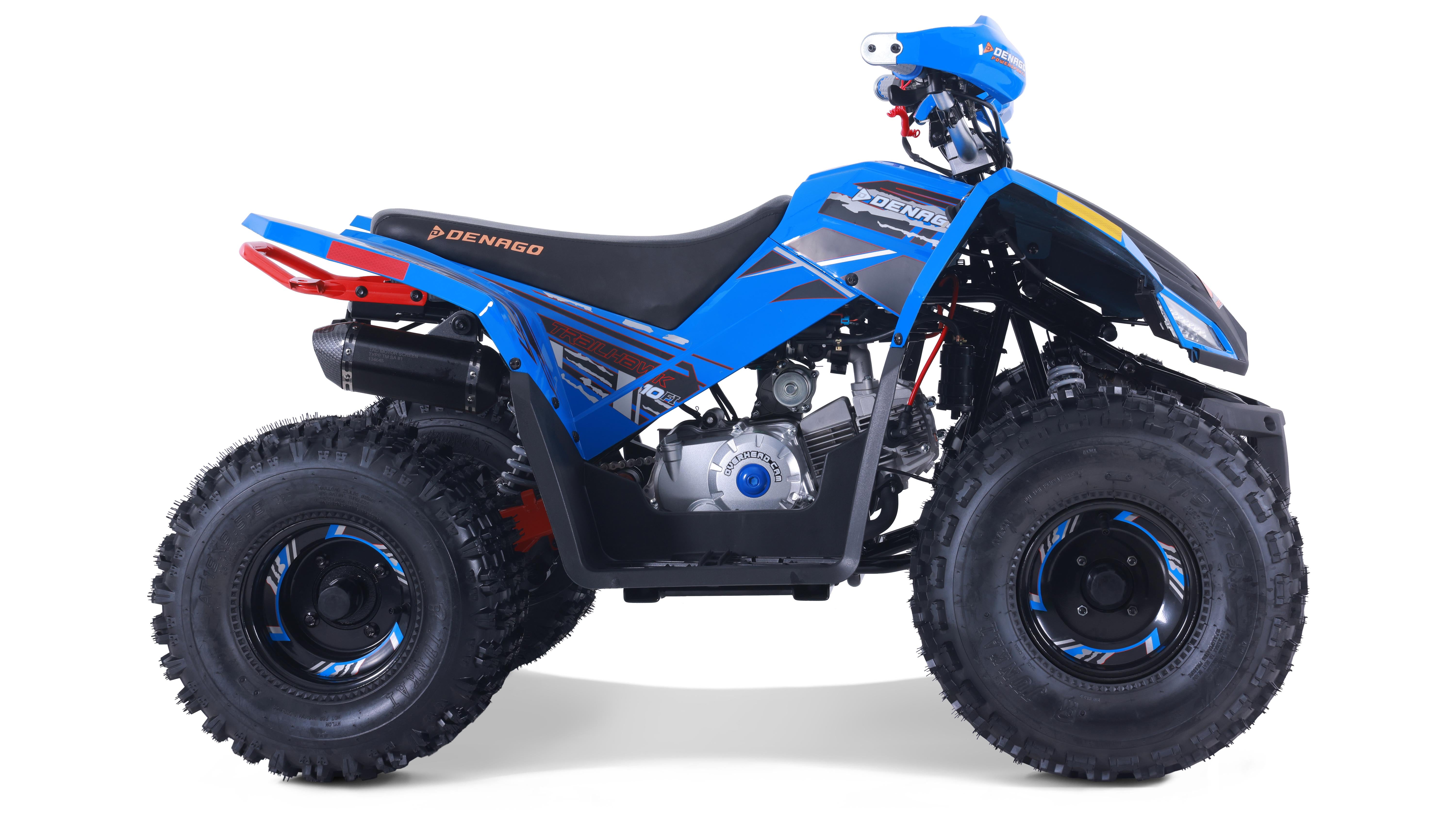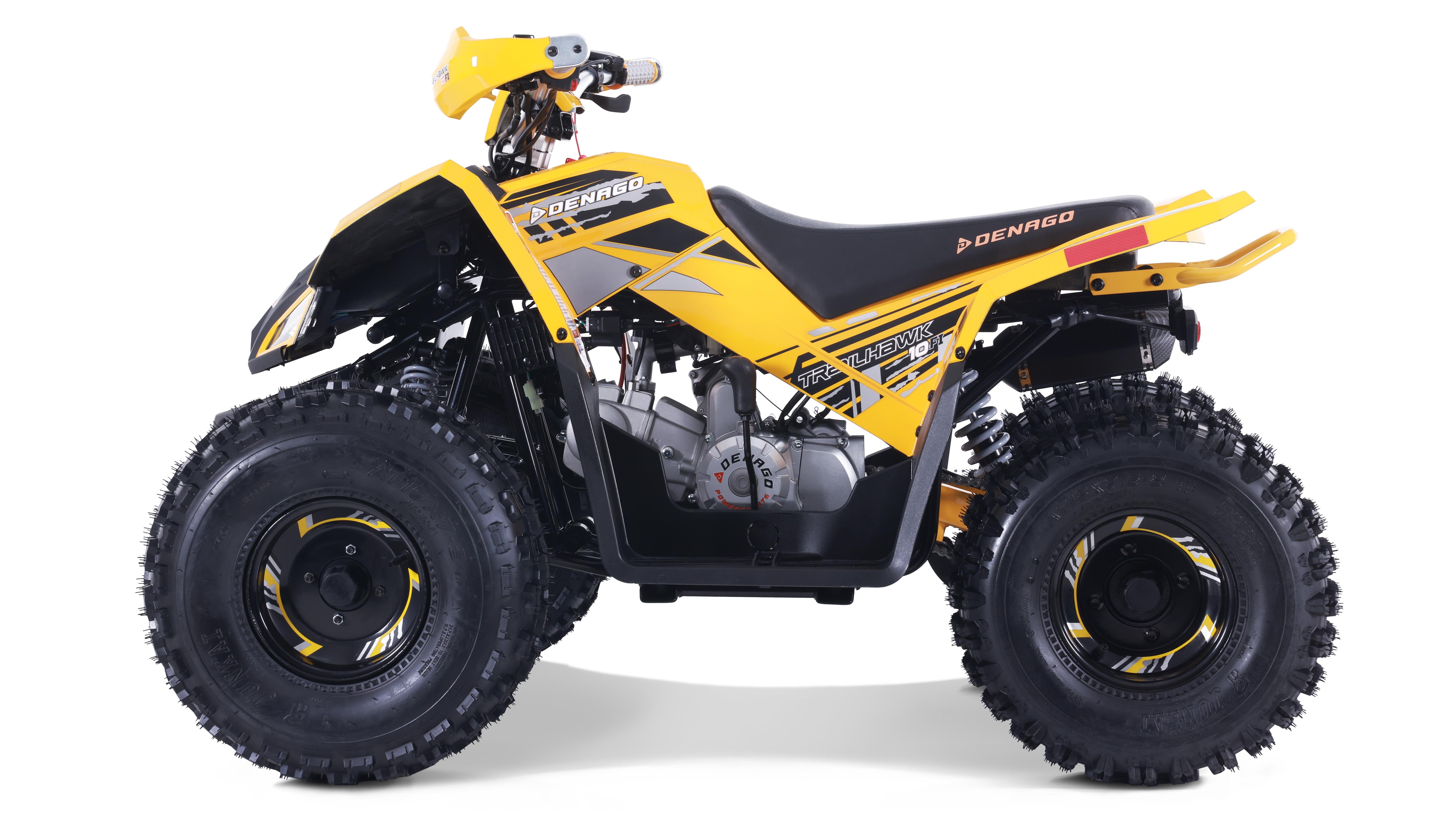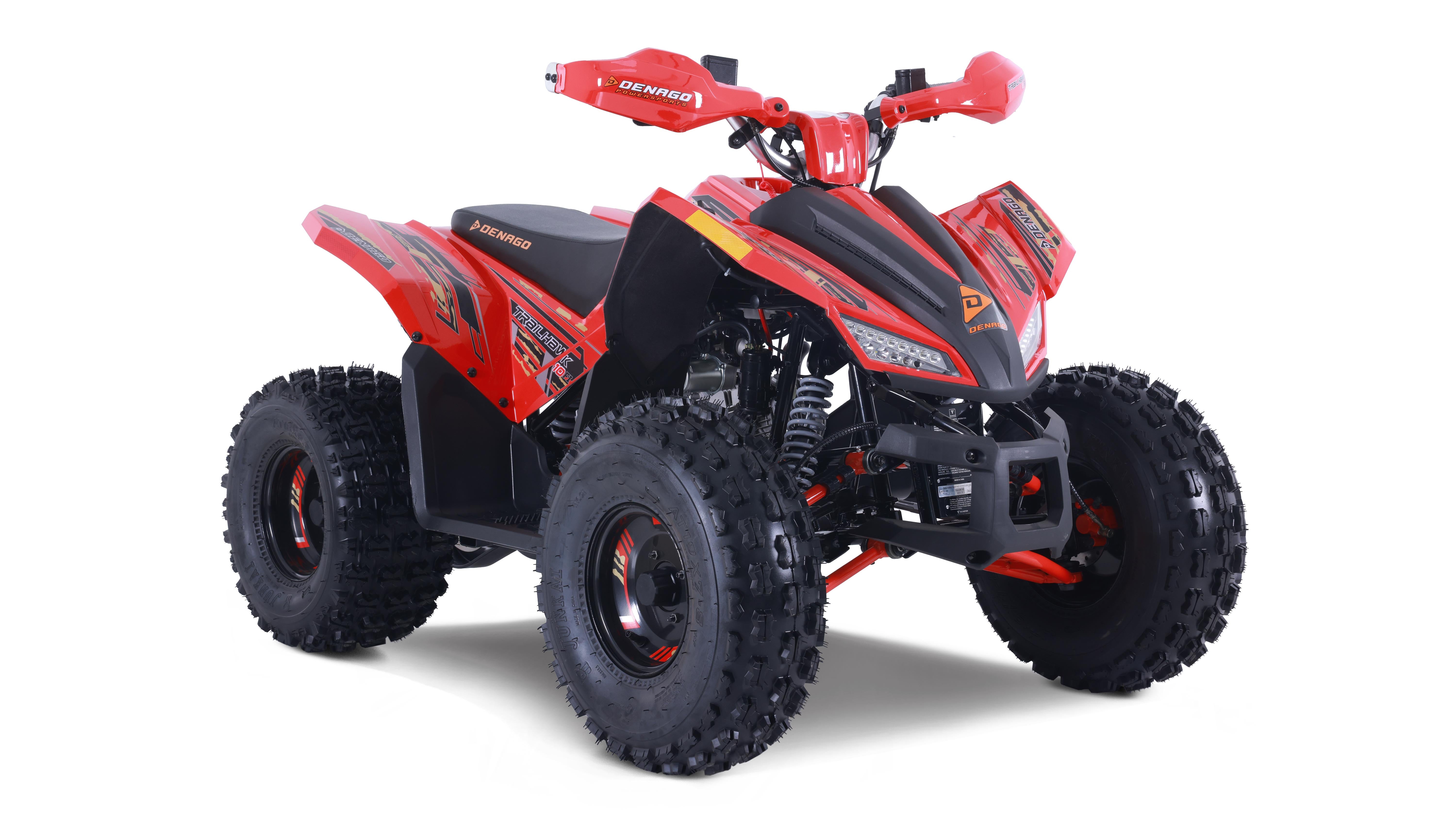 The Trailhawk 10FI is the sportiest Youth-10 ATV on the market, with independent double A-arm front suspension and adjustable shocks, a fuel-injected 120cc engine, electric starting, and sleek sporty style with color-matched handguards and grips. It’s available in 6 colors.